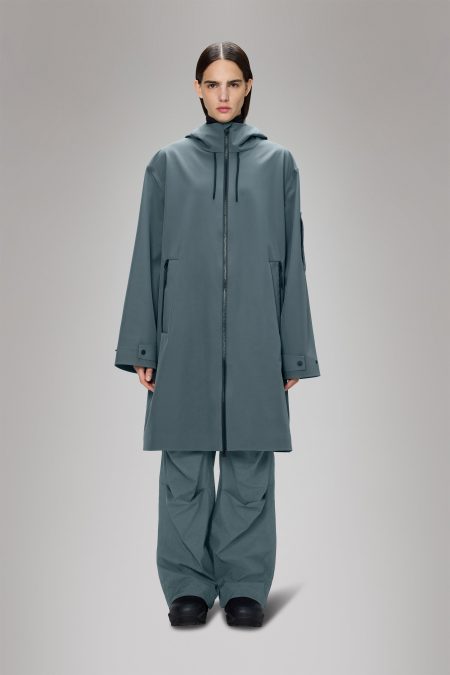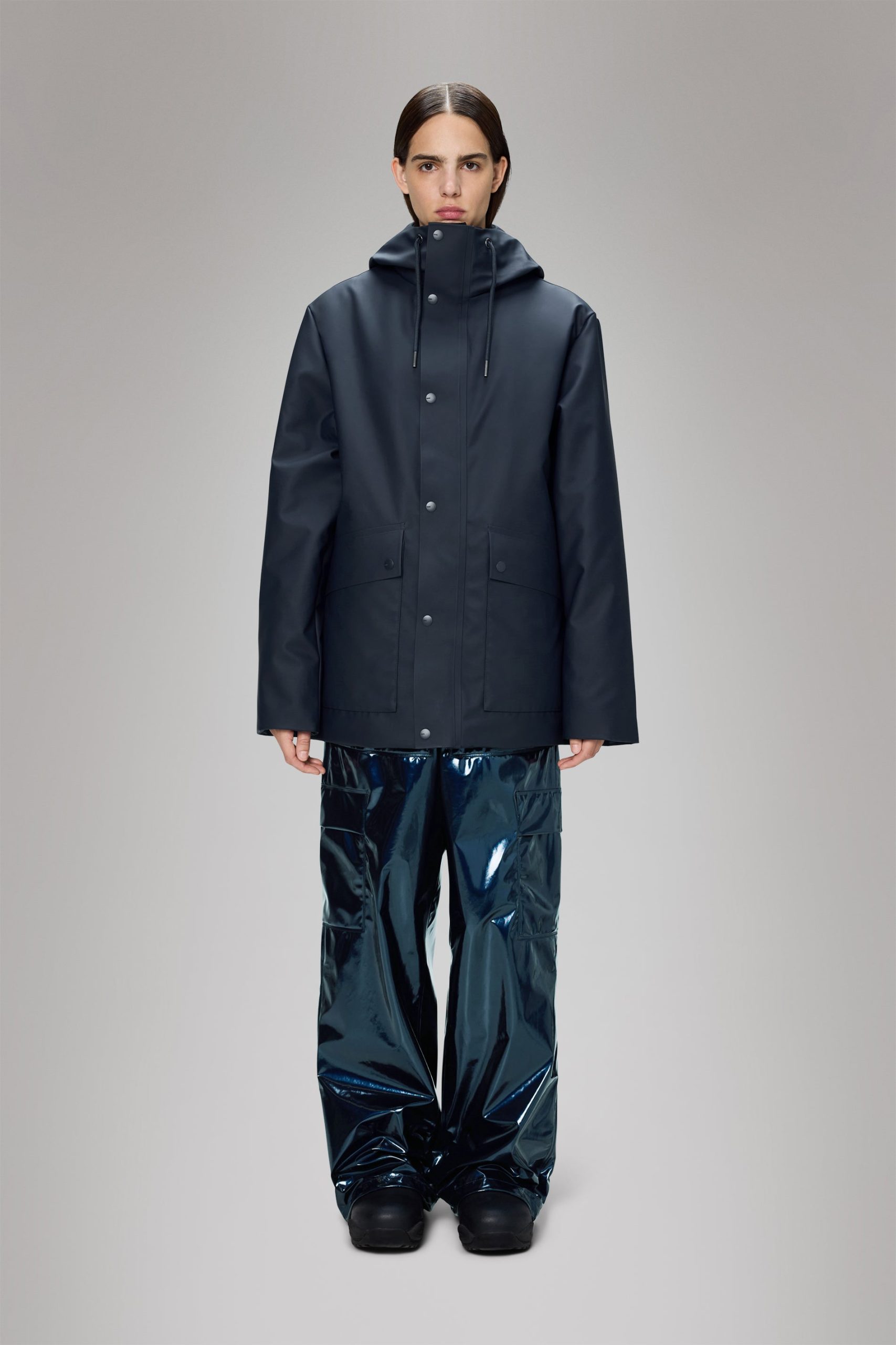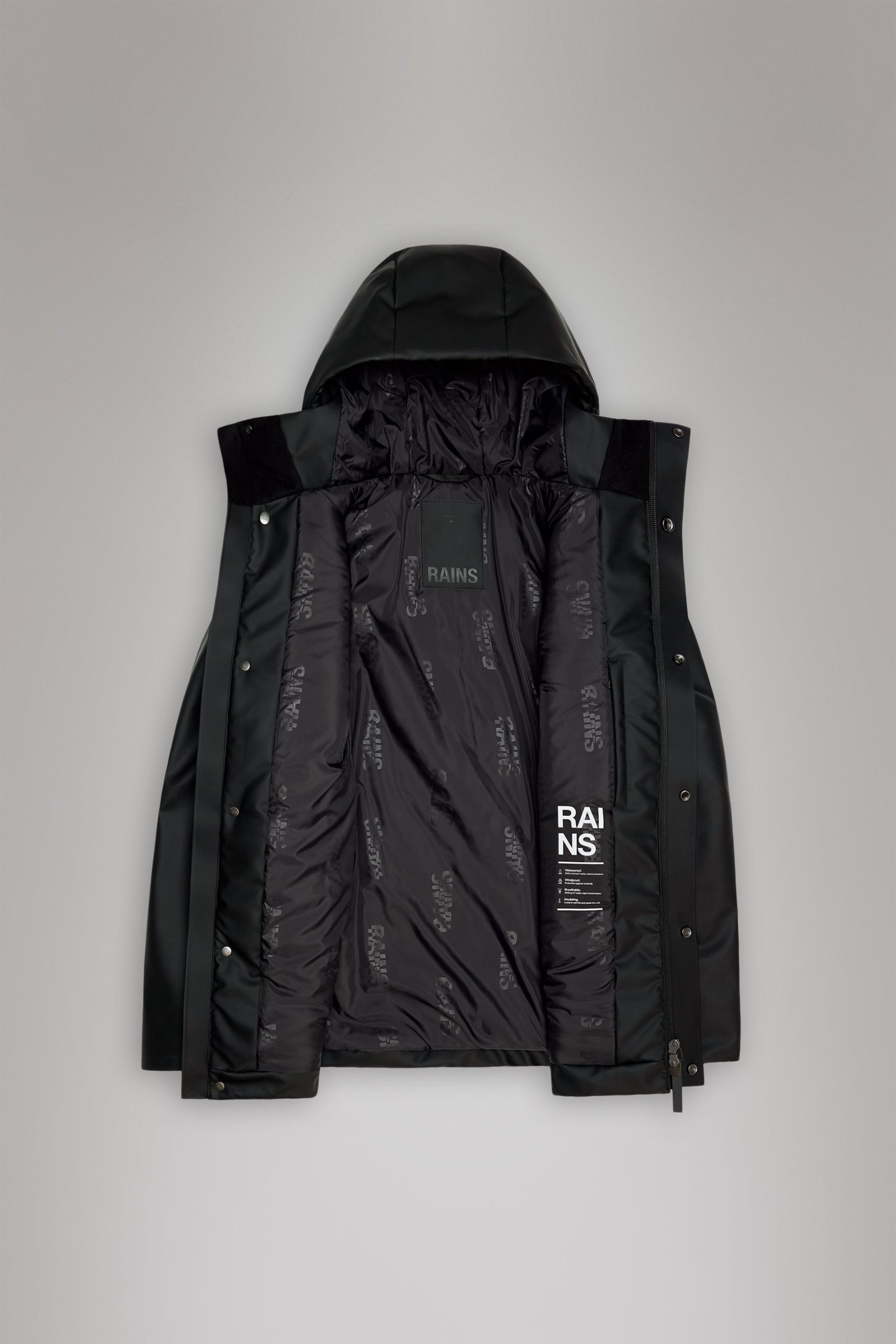 The waterproof jacket is cut from Rains’ signature PU fabric with a strong and durable woven backside. The finish is clean with a sharpened look and a smooth feel.